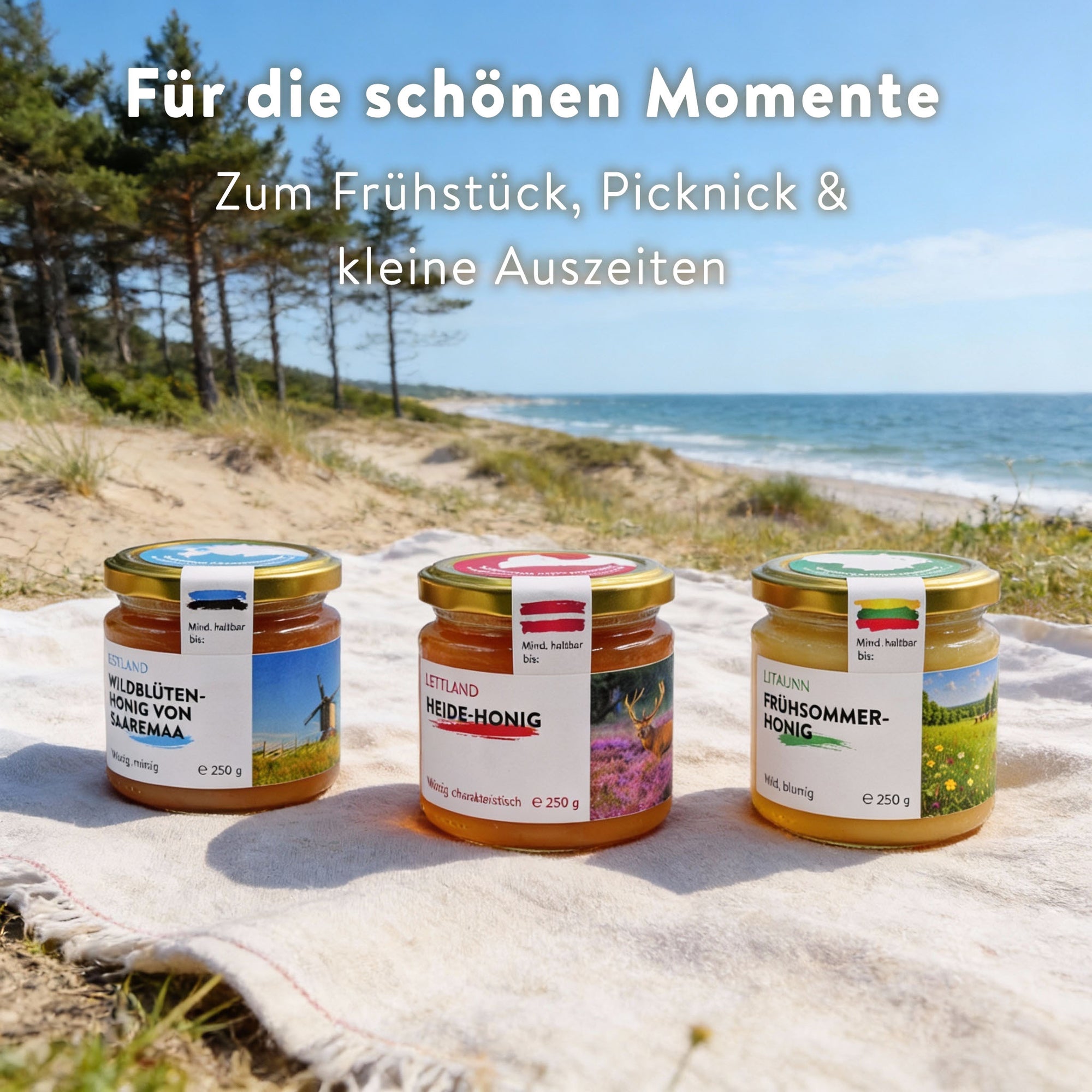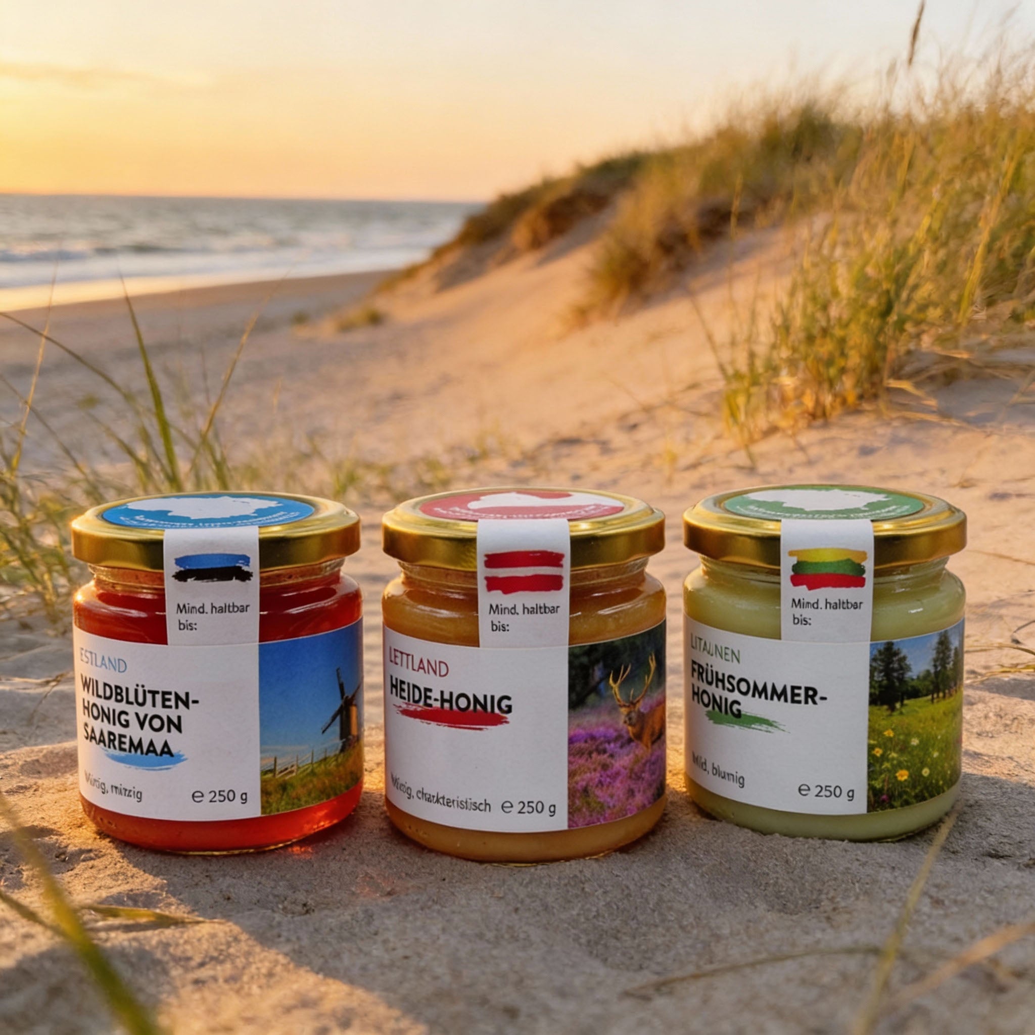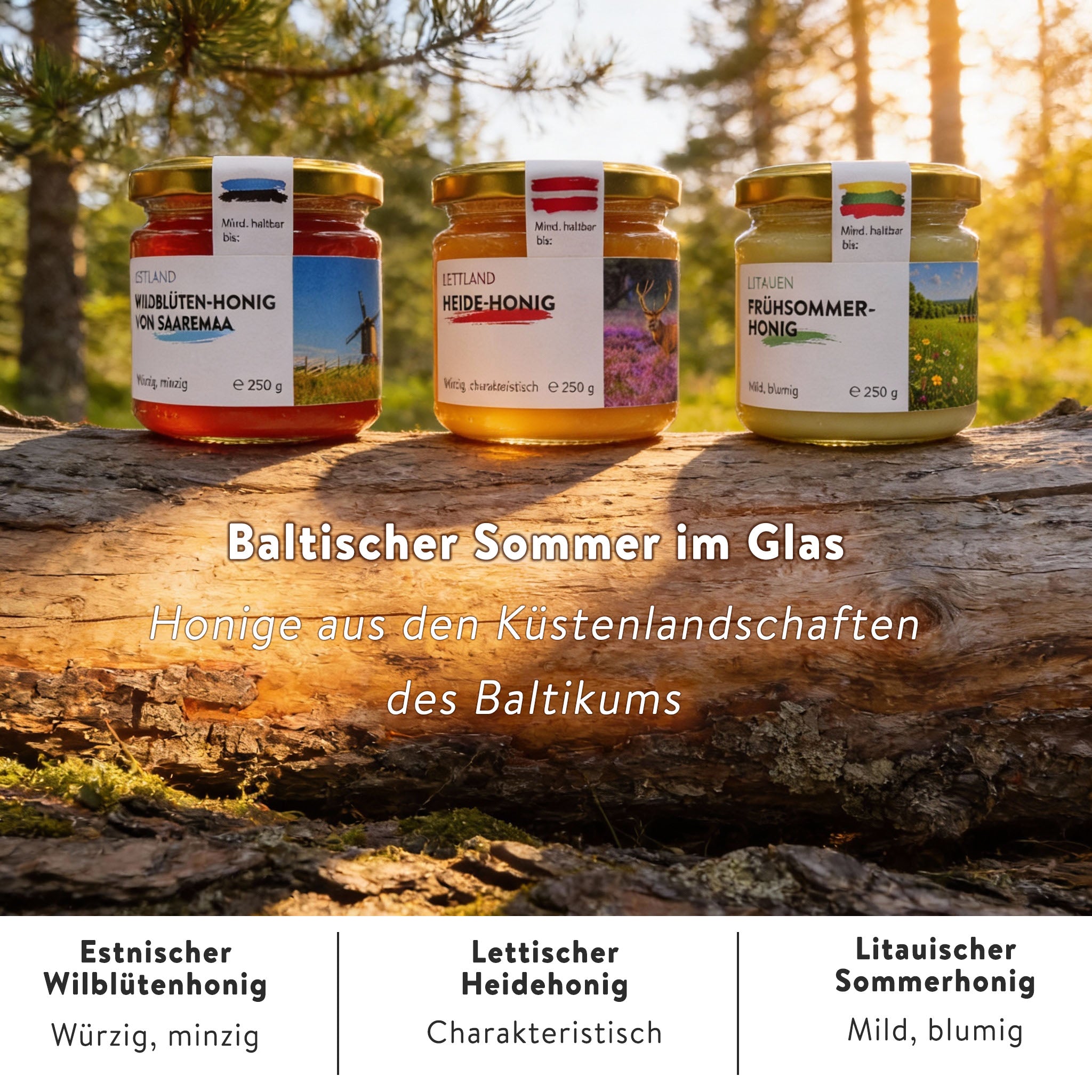 Vom mild-lieblichen Frühsommerhonig, über würzigen Heidehonig aus Lettland bis hin zum frisch-minzigen Wildblütenhonig von der estnischen Insel Saaremaa – diese Trilogie ist perfekt zum Kennenlernen, Genießen oder Verschenken.